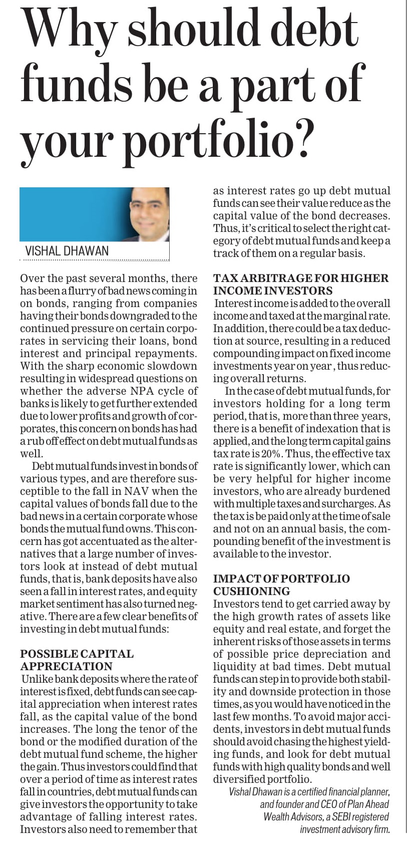 An individual can also invest in a debt of a hybrid mutual funds based on one’s risk appetite. Then for regular income, set up an SWP or systematic withdrawal plan which pays out a specific sum at regular intervals to the investor. If you have risk appetite and ample liquidity, you can also invest a portion in equity funds which will help beat inflation in the long run. Post retirement period need not be a short period. You must prepare for what if you outlive your expected life expectancy.